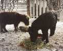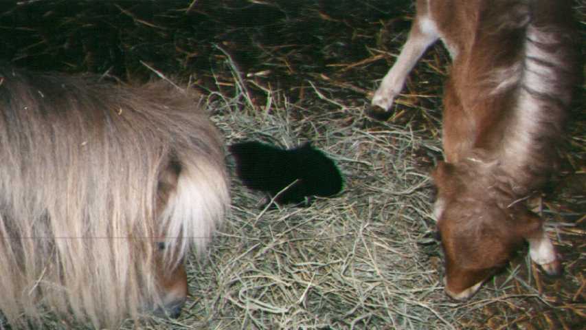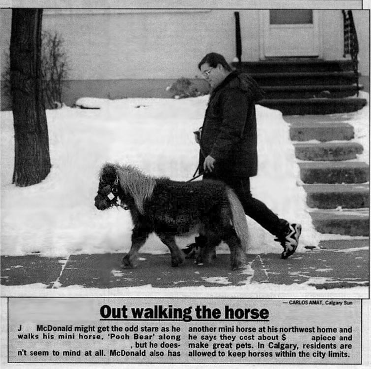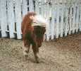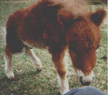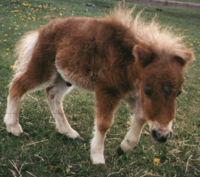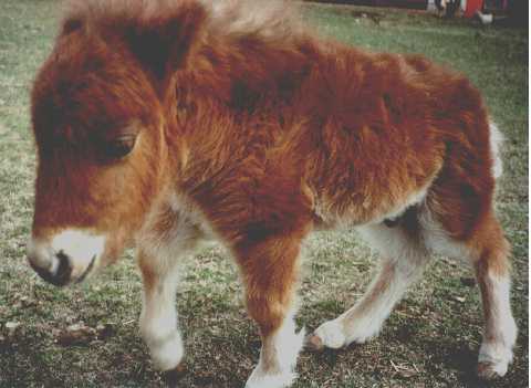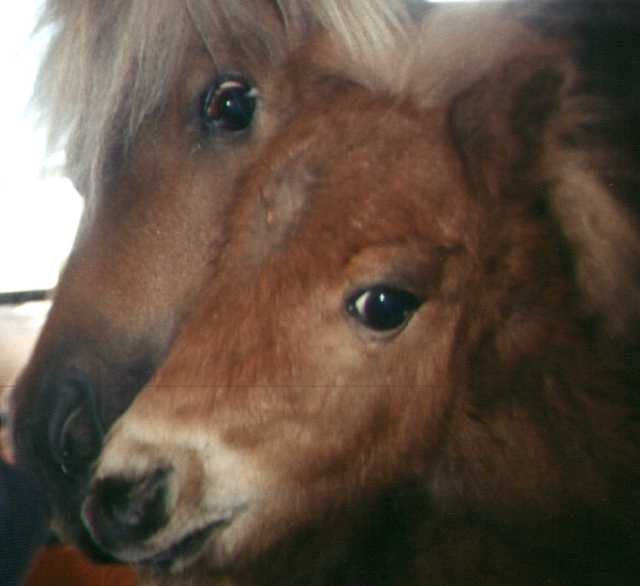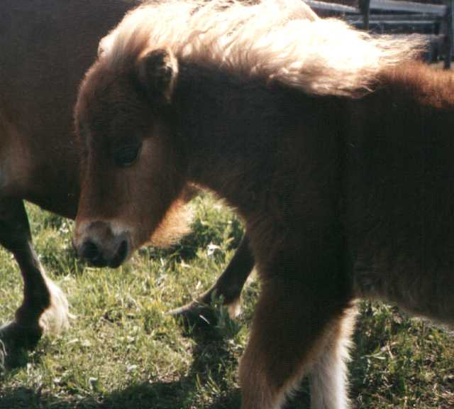 J.R. MacDonald ![]() ![]() When Tonka passed away on Easter Monday in 1996, a part of me died with her. It would be a little over a year before another special horse would enter my life. But now, one has. Even when he's full-grown, he'll barely be knee-high to Tonka, but he'll hold as dear a place in my heart. I'd like to introduce everyone to Pooh-Bear, my new miniature horse colt! ![]() Poohbear and his dam Penelope (Pen-el-o-pee) arrived on August 17th, 1997 after months of preparation to build their new home for them in my backyard. It took a lot of time and work, but it was well worth it. Penelope stayed with me and PoohBear in the city until November 23, 1997 when I had to make a hard choice. I had become very fond of my special little mare, but I also knew that she would be better off back on the farm, and that PoohBear would be better off with a playmate his own age and sex (thus eliminating the need to castrate him). So, with no small amount of sadness, I sent Penelope back to her farmland home, and exchanged her for my new colt - Russel's Dirk. It's been a few months since Dirk's arrival, and he seems to have settled in quite happily with PoohBear and myself. He's still on the skittish side, but he's getting more and more trusting every day, and he aways comes up for a wary hug and nuzzle before scampering off to create more mischief with PoohBear. The two colts get along very well, being close to the same age and having bonded much faster than anyone had expected. I expect their youth has a lot to do with this, and it's hard to keep in mind that neither of them is even one year old at the time of this writing. They take turns chasing each other, grooming each other, and just generally horsing around. The first images on this page show PoohBear at just three weeks old! I've been trying to take pictures of him on a regular basis, allowing me to share his growth with my friends out there on the World Wide Web. The newer pictures show PoohBear and Penelope at home in their paddock in my backyard, and the newest ones show PoohBear and Dirk. Unfortunately, once the horses arrived here, I was kept so busy taking care of them that I didn't have as much time for picture taking as I did in the past, nor are my notes quite as accurate as they were at first, so I can only approximate their ages with the later pictures. I will always be adding more pictures to add to these pages, so please be sure to check back often. ![]()